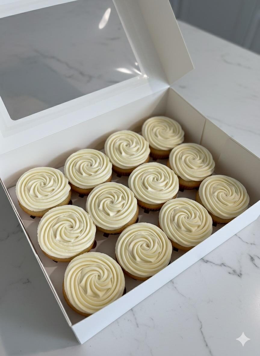 Soft vanilla cupcake topped with smooth vanilla frosting, made fresh daily.